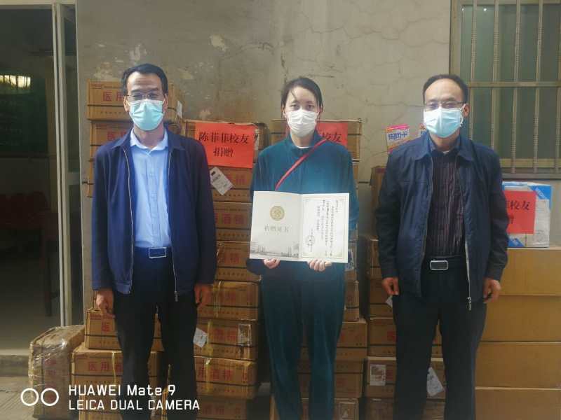 4月27日下午,koko体育2018届校友陈菲菲女士向学校捐赠防疫物资,校友联络中心主任杨勇、koko体育官网党委书记袁金群等老师参加了捐赠仪式。