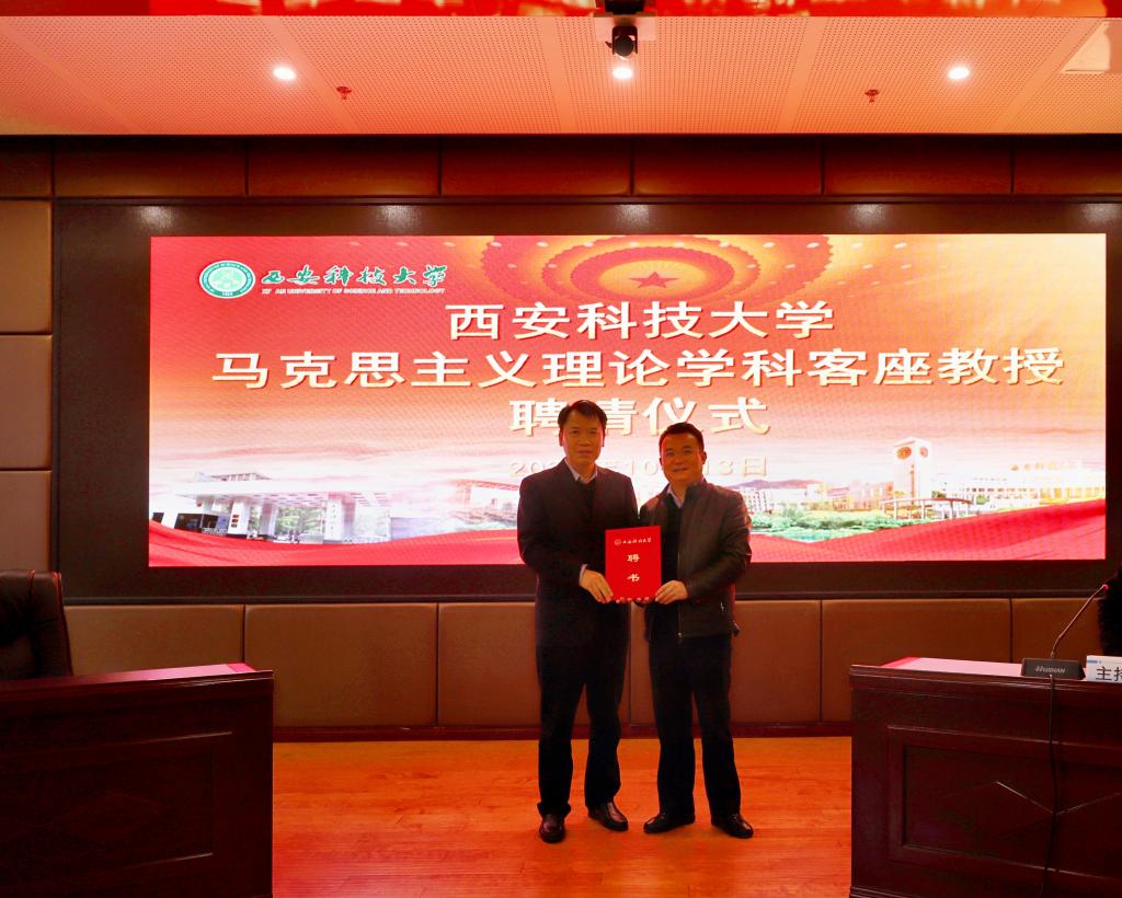 10月13日下午,马院在骊山校园煤炭科技中心二楼报告厅举行马克思主义理论学科客座教授聘请仪式暨专题报告会,校党委副书记樊建武代表学校颁发聘书,聘请李东涛主任为马克思主义理论学科客座教授。聘请仪式暨专题报告会由学院党委书记卫晓君主持。