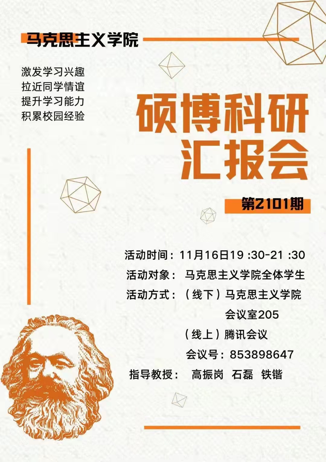 为促进学生成长,提升研究生培养质量,推进马克思主义理论学科建设,11月16日晚7:30,koko体育官网在骊山校园1教205会议室举行了第2101期硕博科研汇报会。院长高振岗、副院长铁锴,以及骊山校区硕士、雁塔校区博士共计100余人,分别在线下、线上参加了此次活动。活动由副院长铁锴主持。