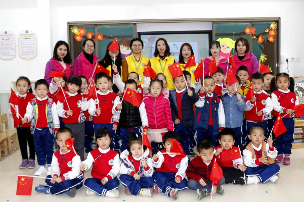 和我校基础教育管理中心主任张永和及幼儿园师生参加完升旗仪式后合影