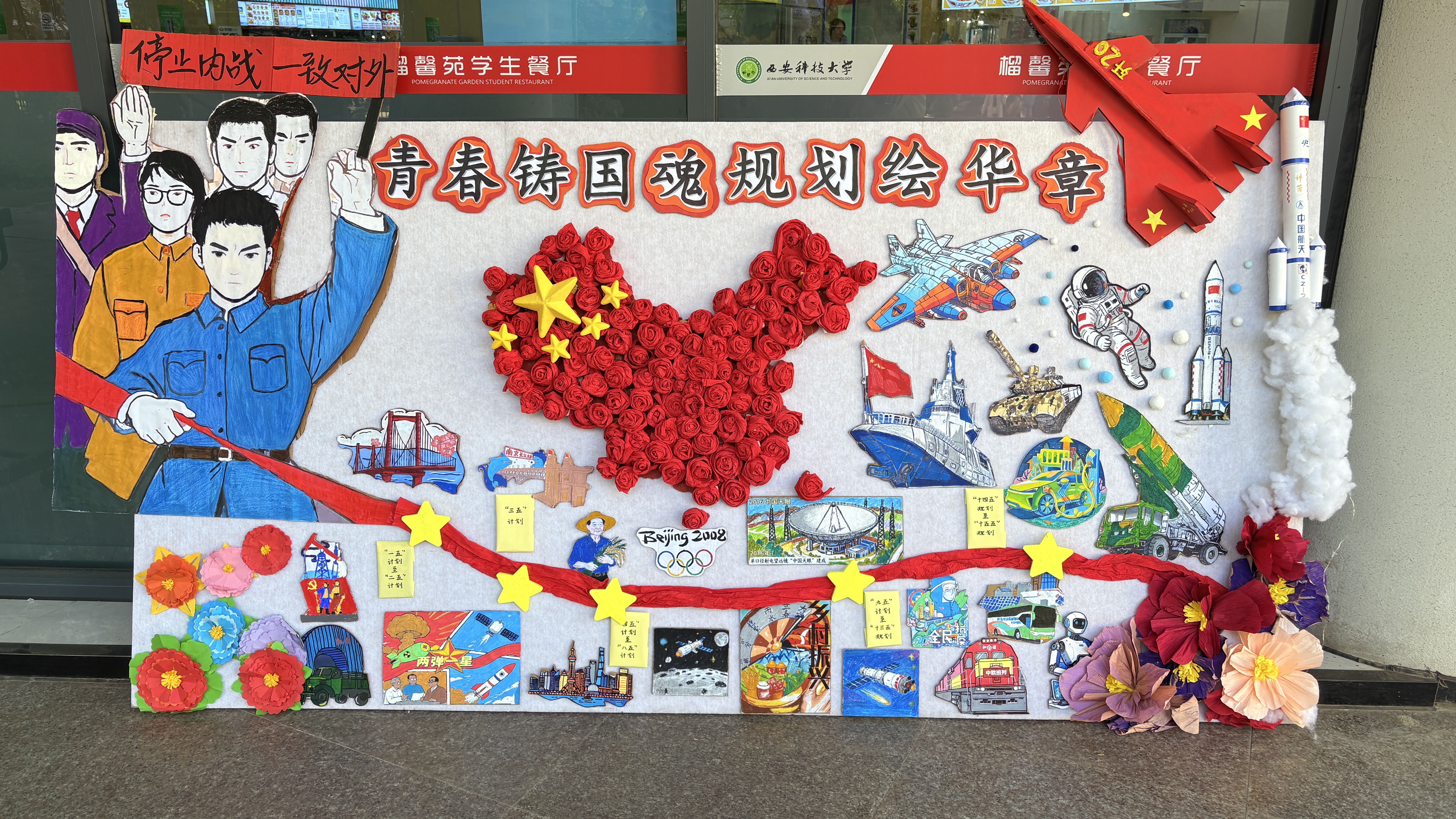 1935年一二·九运动中,北平青年学子振臂高呼“停止内战,一致对外”,用热血铸就的“爱国、进步、民主、科学”精神,成为一代代青年的精神密码。此次参赛作品用艺术语言搭建起青春力量与国家规划的联结桥梁,深刻诠释了“一二·九”精神跨越90年的时代传承。作品以红色玫瑰拼贴成的中国地图作为视觉主体,凝萃着“一二·九”青年的热血赤诚与国家发展的蓬勃活力;地图下方的红丝带串联起“一五”计划至“十四五”规划期间的核心成就,清晰勾勒出规划引领发展的轨迹与青年接力奋斗的精神纽带;回望过往,东风系列导弹、100式智能主战坦克、C919大飞机、福建舰、歼-20等众多成就的背后是青年科研者的攻坚克难与青年建设者的日夜坚守;展望“十五五”,航天探索向深空迈进,国之重器迭代升级,新一代青年必将以“一二·九”精神为指引,在各领域勇攀高峰,以青春热血赴时代召唤,助力实现中华民族伟大复兴的中国梦。