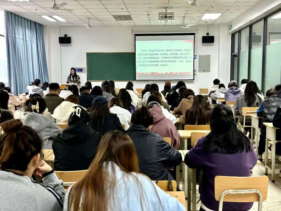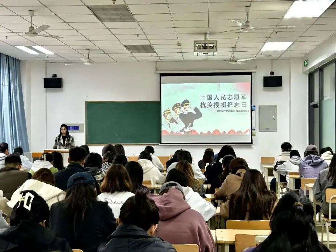 活动伊始,主持人首先向与会同学介绍了抗美援朝战争的历史背景及伟大意义。随后,通过播放抗美援朝纪录片,重温那段烽火连天的峥嵘岁月。