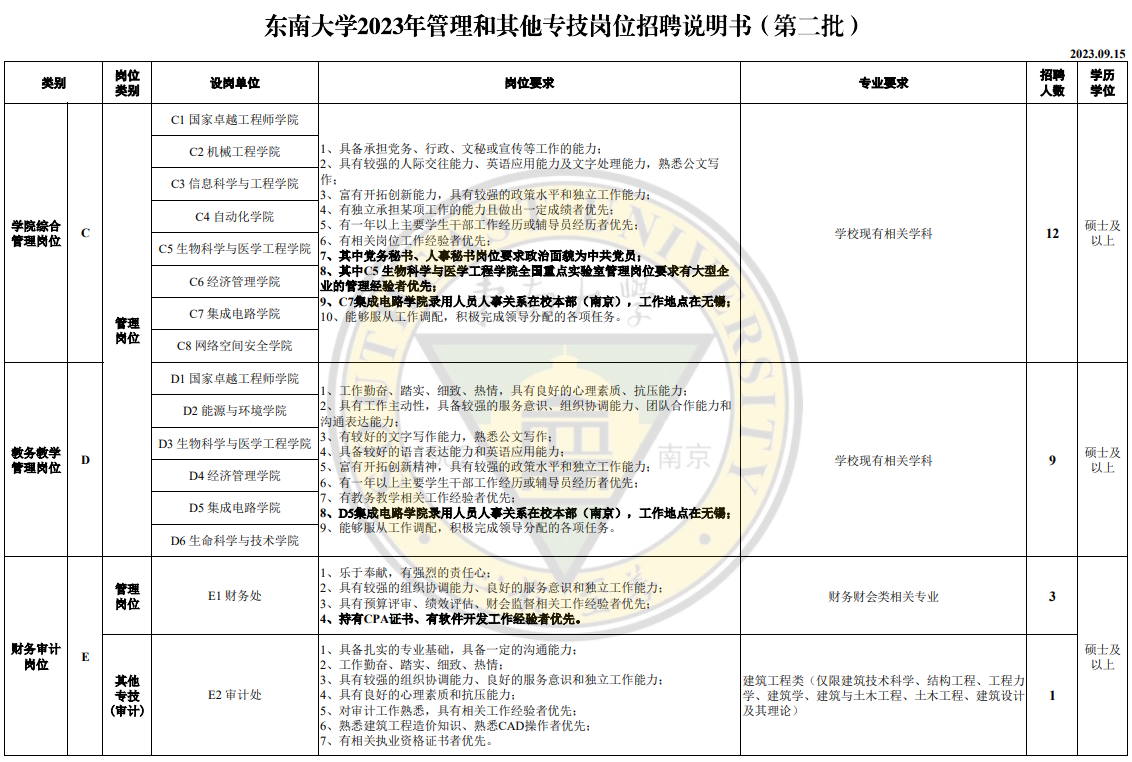 学校面向社会公开招聘党政机关管理岗位32个(其中博士岗位17个)、学院管理岗位21个、机关及直属单位其他专技岗位7个(其中博士岗位1个)。具体岗位职责及招聘要求详见《东南大学2023年管理和其他专技岗位招聘说明书》。