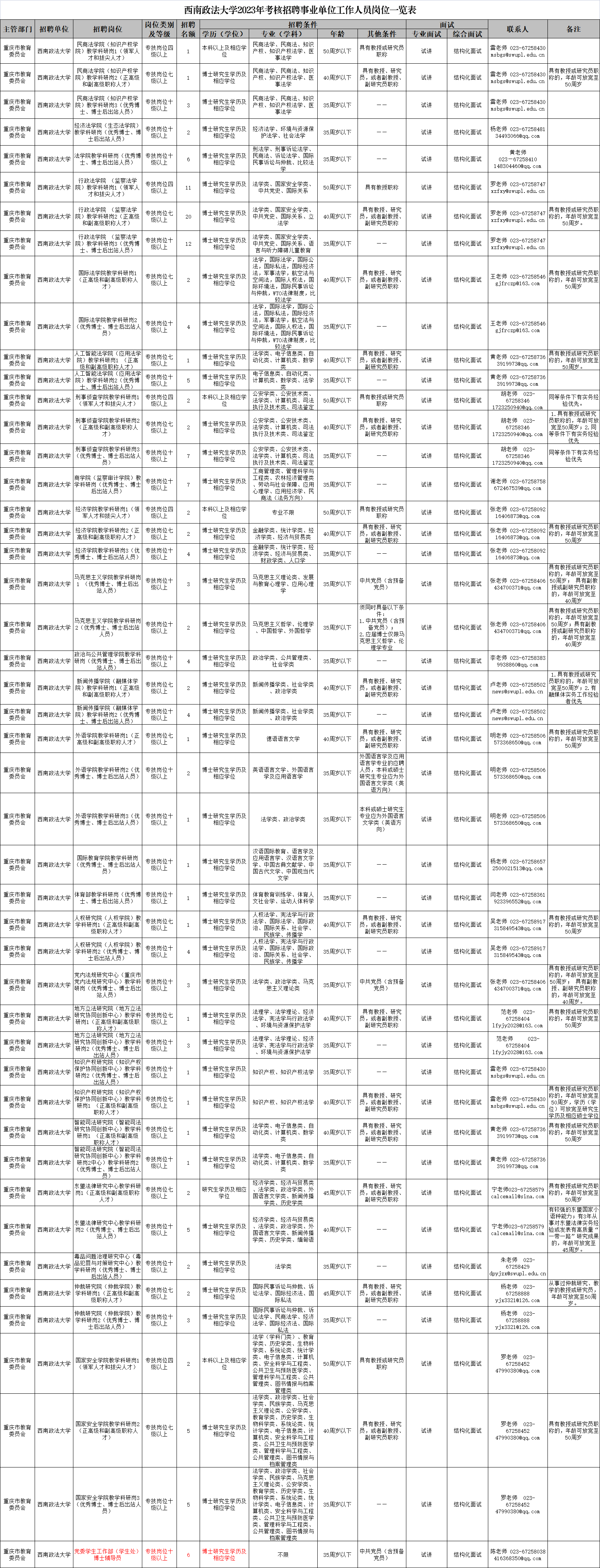 1.西南政法大学2023年考核招聘事业单位工作人员岗位一 览表