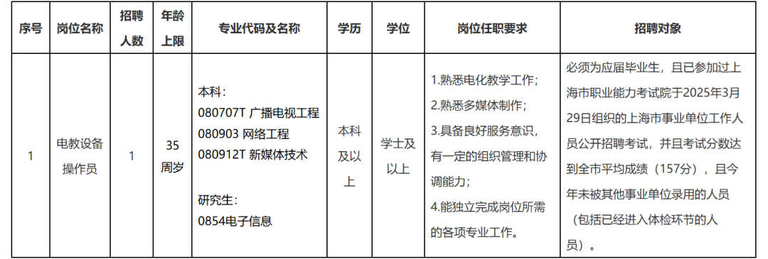 1.电教设备操作员岗位:招聘对象为应届毕业生,且已参加过上海市职业能力考试院于2025年3月29日组织的上海市事业单位工作人员公开招聘考试,并且考试分数达到全市平均成绩(157分),且今年未被其他事业单位录用的人员(包括已经进入体检环节的人员)。