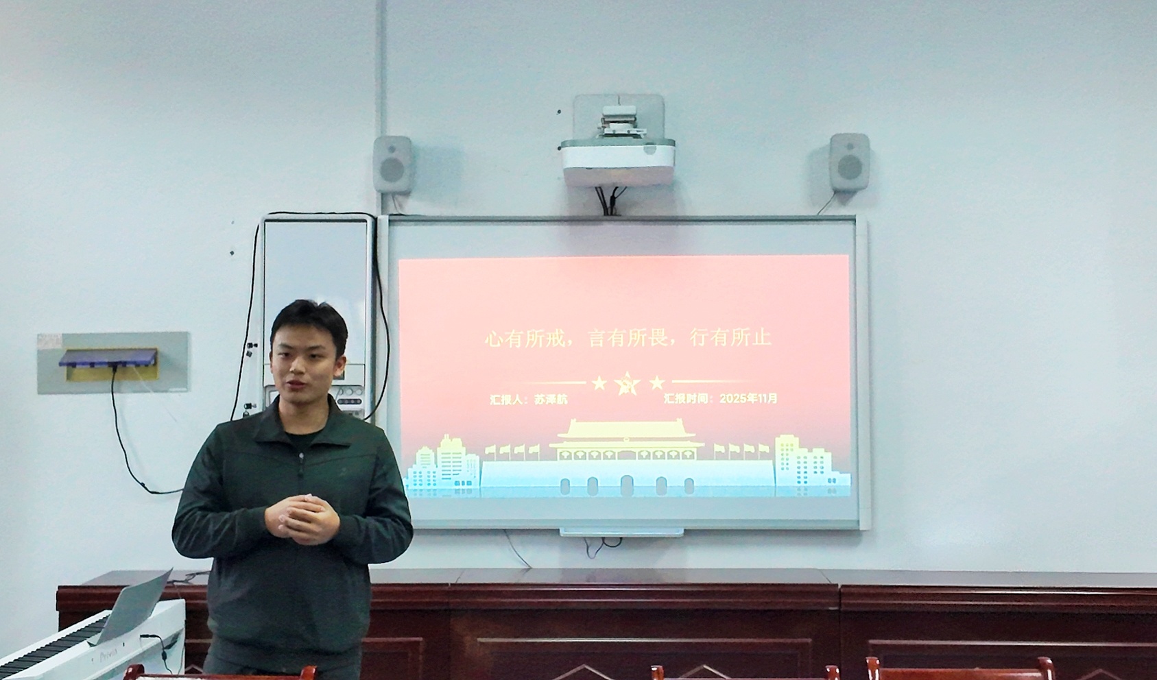 1119日下午,koko体育官网在煤炭科技中心320会议室开展“心有所戒,言有所畏,行有所止”主题班会,25级全体研究生参会。原武警机动部队战士苏泽航同学结合军旅生涯,生动讲述有关自律、协作与敬畏的故事,为同学们成长成才指明了方向。